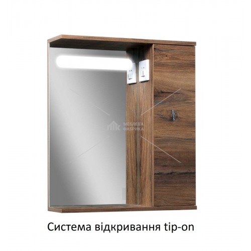 Дзеркало для ванної кімнати Хотин 60 з системою відкривання tip-on праве ПіК з розеткою і вимикачем, оснащене дверкою а всередині дві скляні полички. Корпус виконаний з ламінованого ДСП в коричневому кольорі. Оснащення дзеркала: LED підсвітка, доводчики, розетка,вимикач,навіски.